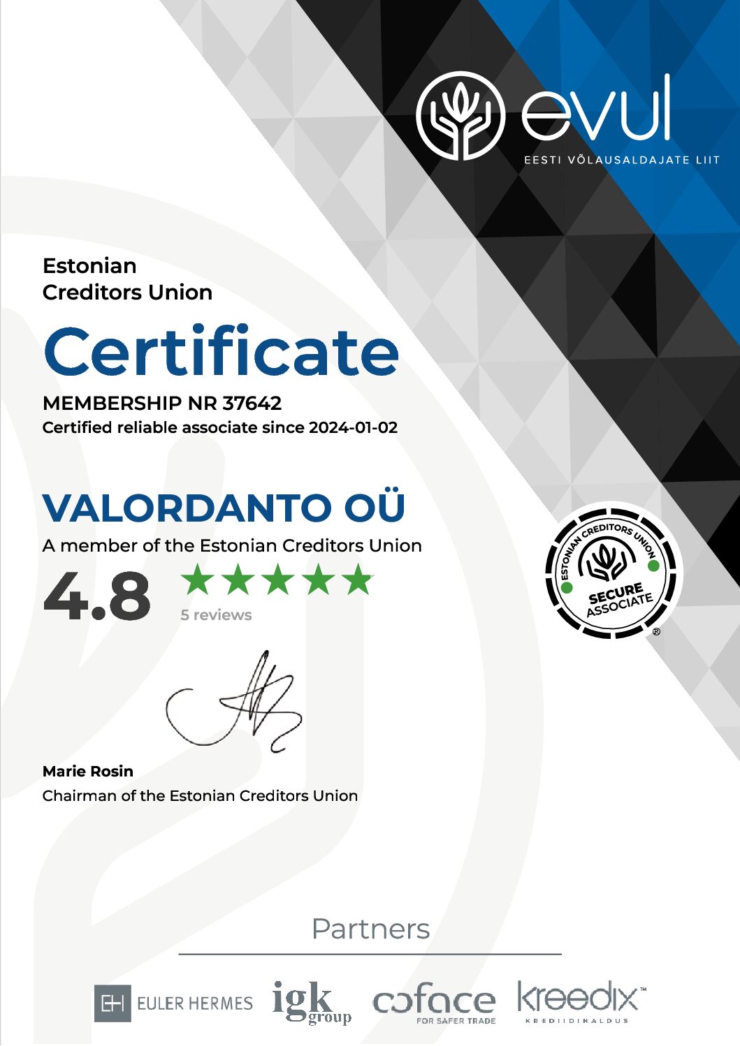 Viimase 25 aasta jooksul oleme saavutanud häid tulemusi. Tänu sellele oleme saanud Krediidiinfo ja Experian poolt tunnistuse Eesti Edukas Ettevõtte 2009a. AA krediidireitingu kategoorias ja sertifikaat Eesti Võlausaldajate Liit.